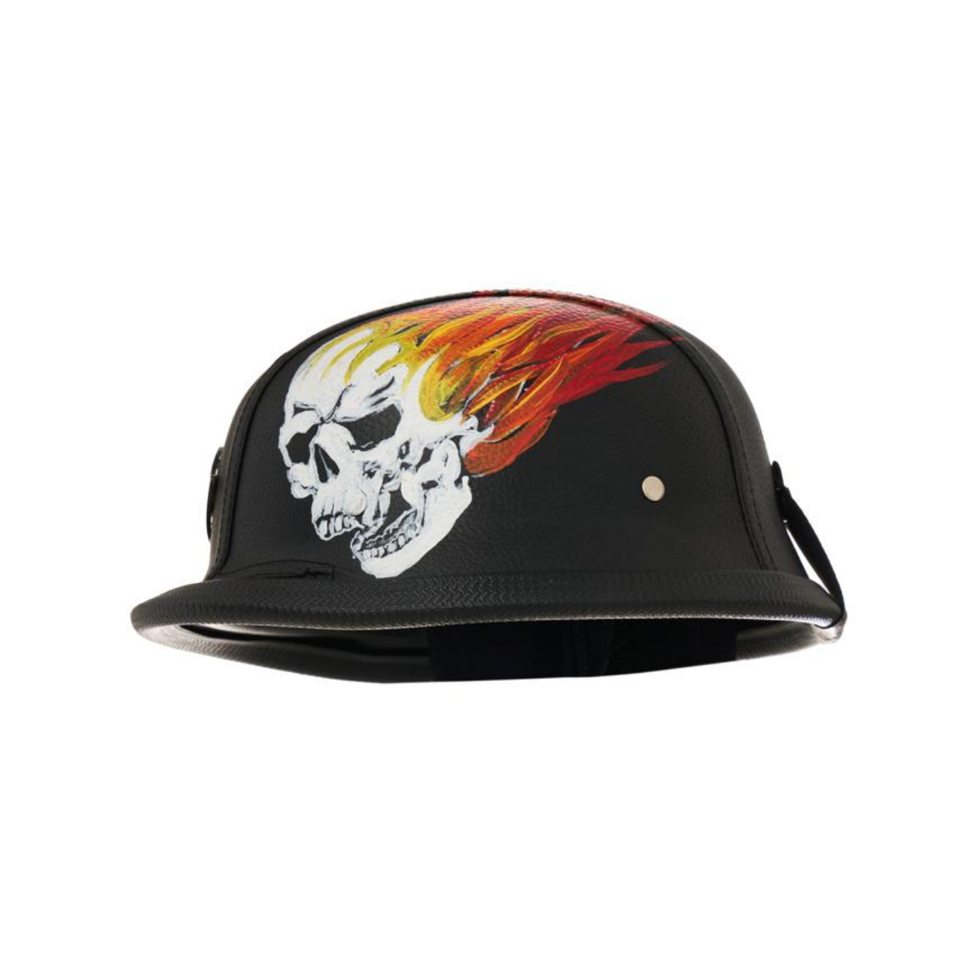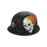 Yolların asi ruhunu tarzınıza yansıtın! “Alevli Kuru Kafa” desenli bu özel tasarım yarım kask, klasik chopper stilini modern bir dokunuşla birleştiriyor. Siyah deri kaplama dış yüzeyi, kaska premium ve sert bir görünüm kazandırırken; yan tarafta yer alan, rüzgarla dans ediyormuş gibi görünen alevli kuru kafa (Ghost Rider) illüstrasyonu, sıradanlıktan uzaklaşmak isteyen sürücüler için tasarlandı.