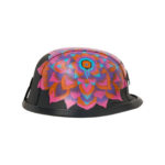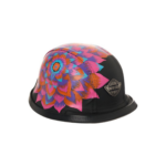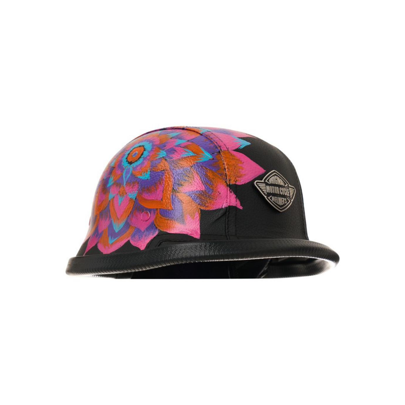 Sürüşünüze renk ve sanatsal bir dokunuş katın! “Renkli Mandala” desenli bu özel tasarım yarım kask, sert deri görünümünü zarif ve canlı motiflerle buluşturuyor. Siyah suni deri kaplama zemin üzerine işlenmiş; pembe, mor, turuncu ve turkuaz tonların hakim olduğu büyük mandala çiçeği deseni, kaska pozitif ve enerjik bir hava katar.